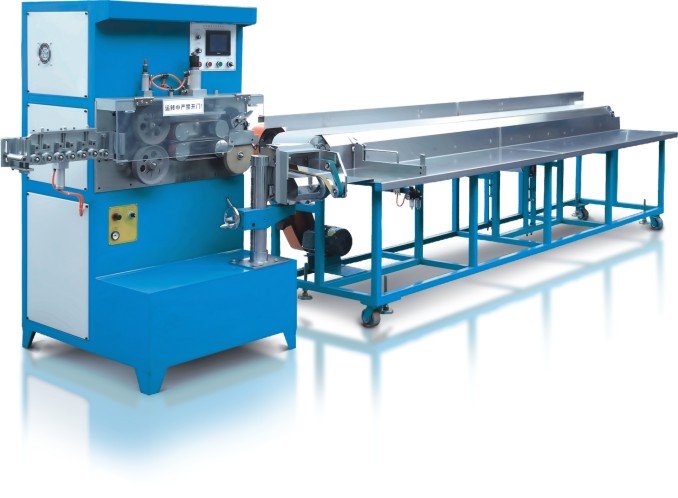 采用PLC微電腦+伺服系統(tǒng)+氣動控制,由整直機構(gòu)、計米裝置、皮帶牽引機構(gòu)、裁線機構(gòu)、送線機構(gòu)、皮帶拖線機構(gòu)和推線機